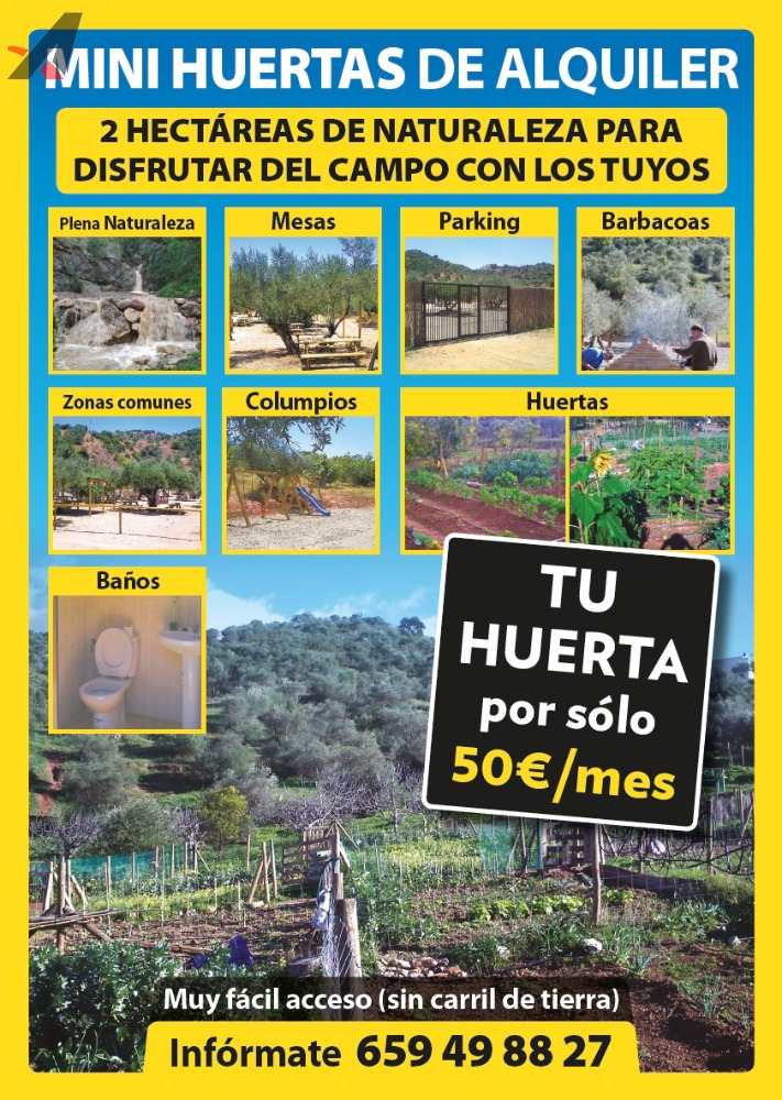 A 10 minutos del Puerto de la Torre. En plena naturaleza, 2 hectáreas para disfrutar del campo con los tuyos. Con mesas, parking, barbacoas, columpios, zonas comunes, baños. Fácil acceso sin carril de tierra. Las huertas miden 45 m2.