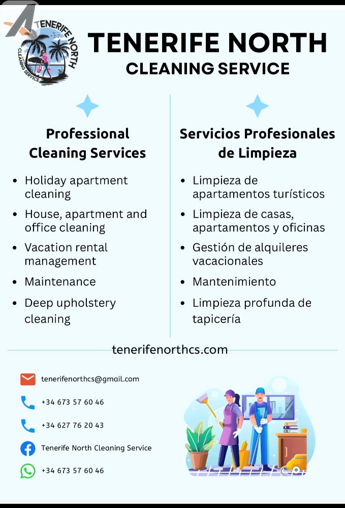 Nuestra empresa, Tenerife North Cleaning Service, está formada por un equipo polaco que ofrece servicios personalizados de limpieza vacacional y comercial, administración de propiedades y limpieza de tapicerías. Contamos con una amplia experiencia en el mantenimiento de la limpieza y el atractivo de su hogar. Nos comprometemos a garantizar la satisfacción de nuestros clientes con nuestros servicios.